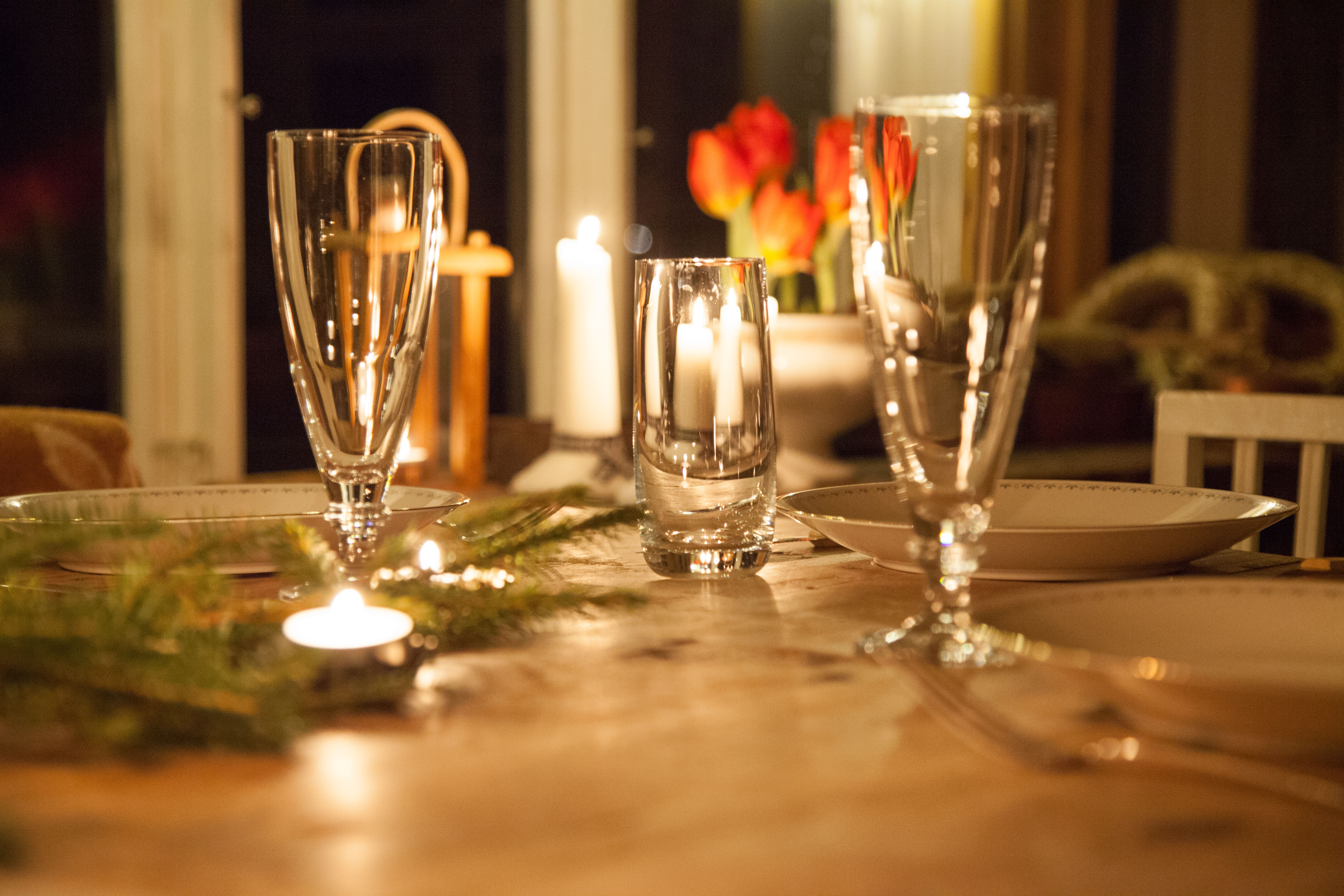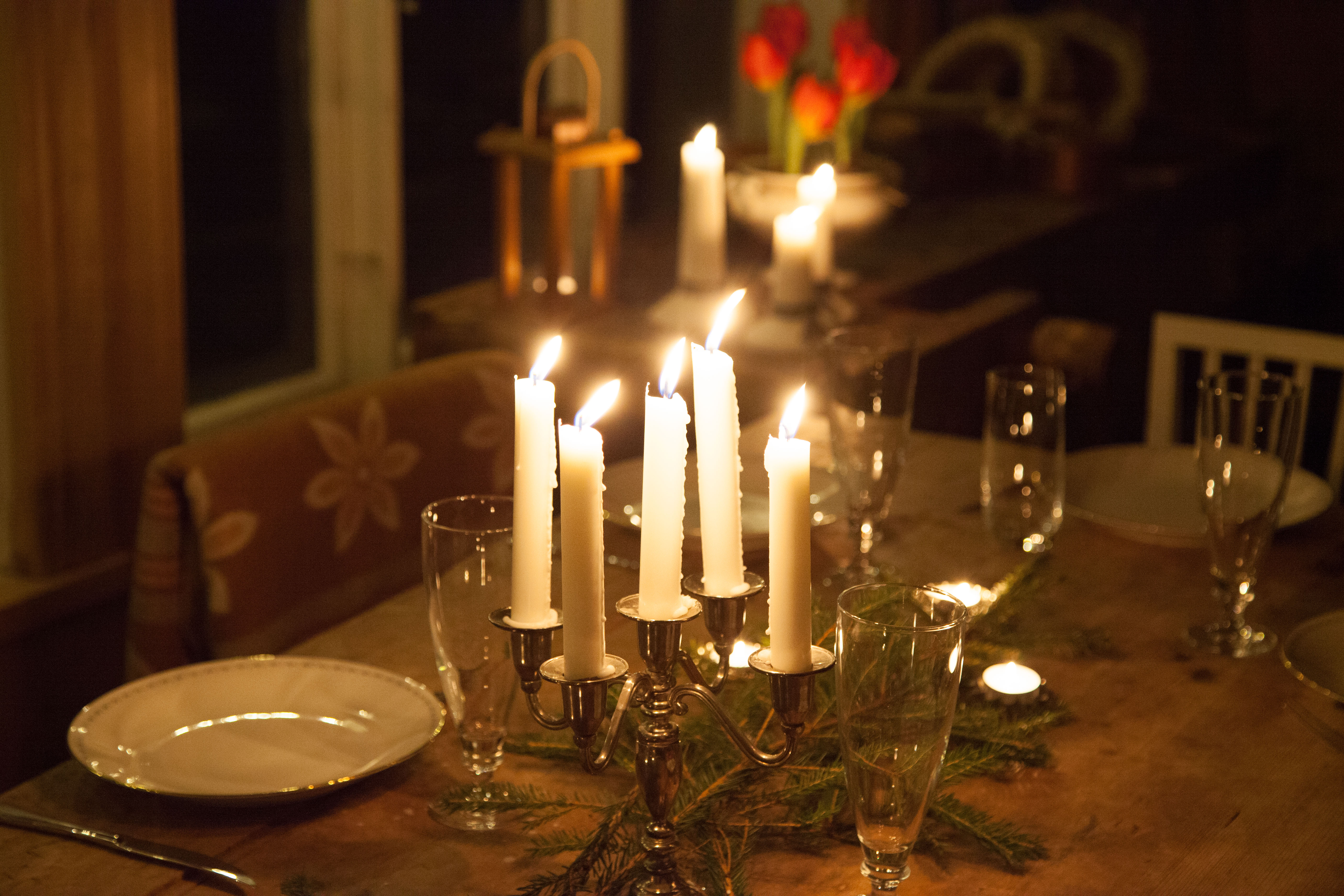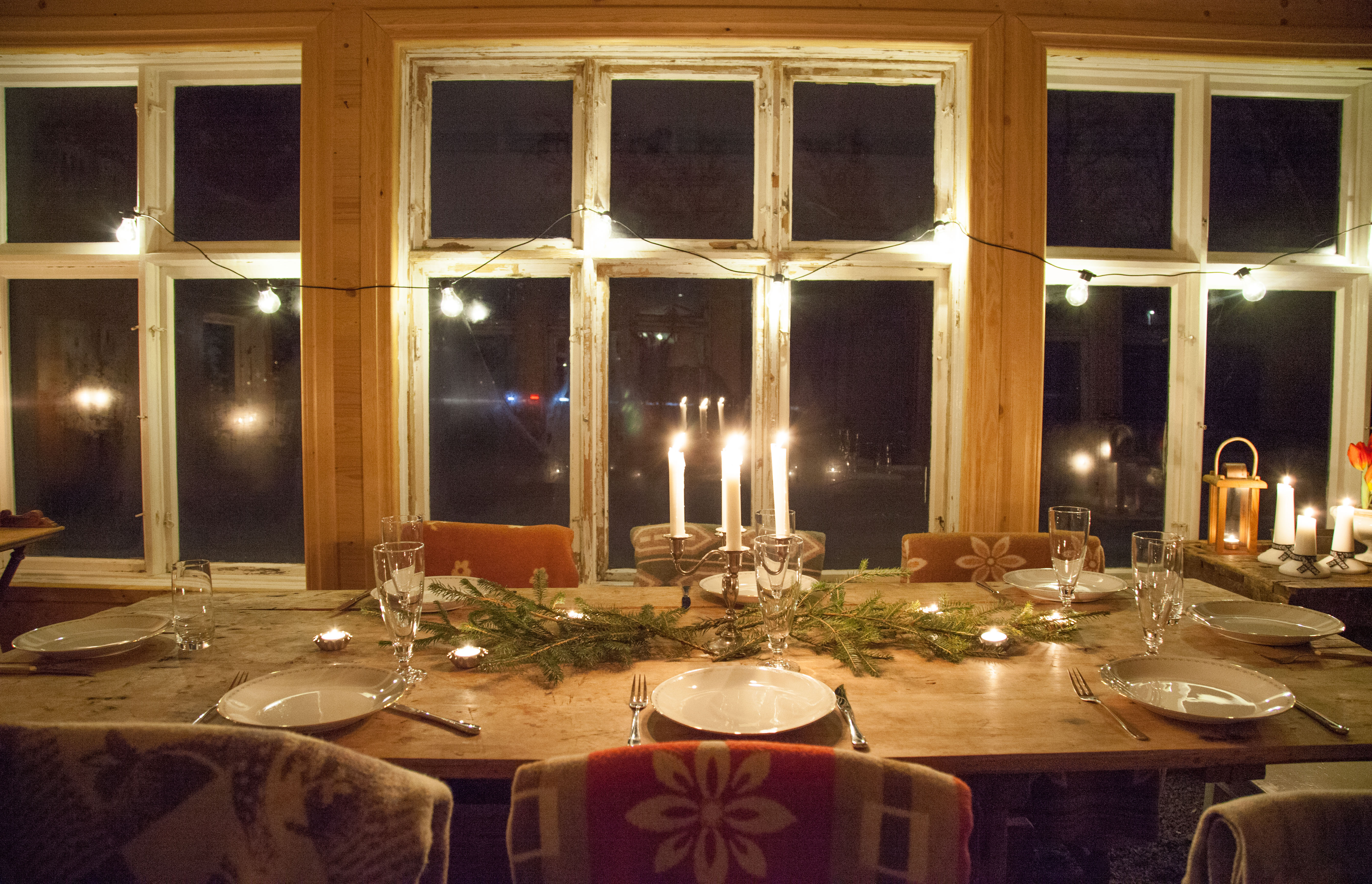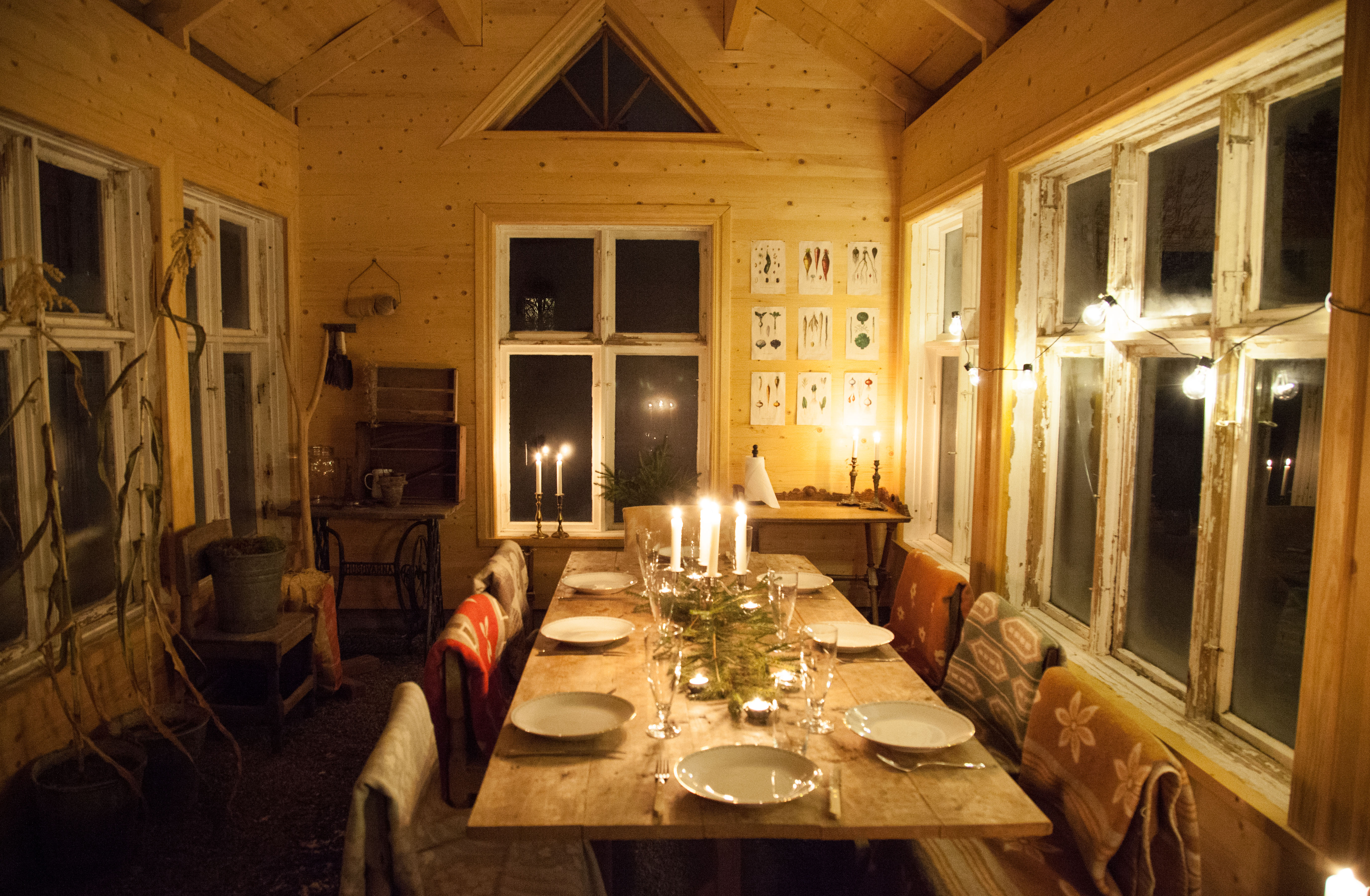 Växthuset har stått oanvänt sedan jag hade gårdsbutik där i höstas så det var lite stökigt och skräpigt men vem bryr sig? Jag styrde bara ihop tomma krukor och vattenkannor i ett hörn, sopade av bordet och bar in några fler stolar. Udda ullfiltar på varje stol, en slarvigt upphängd ljusslinga, en massa tända ljus, dukning och lite granris på bordet och sedan var det klart.