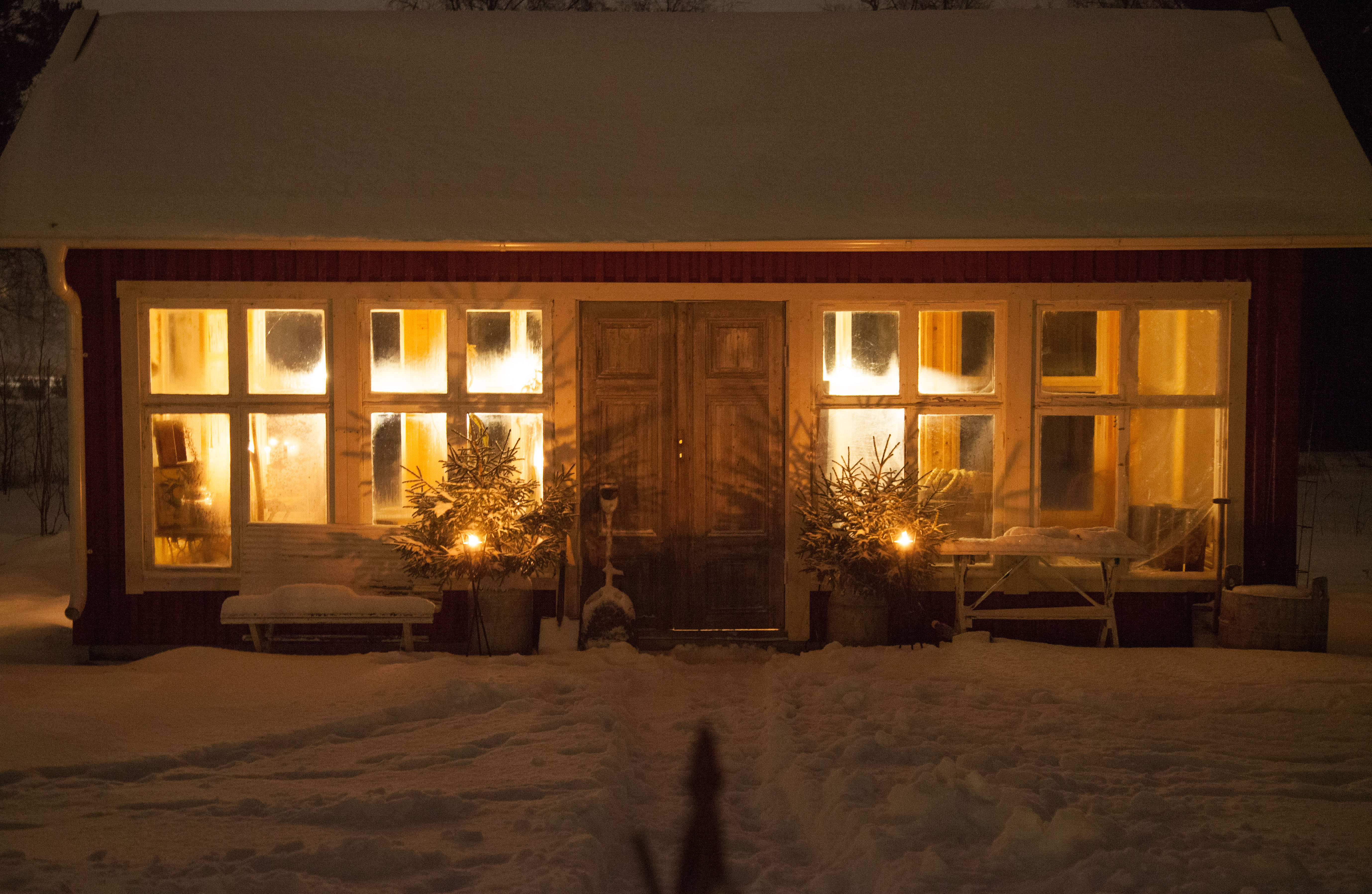 Hur har du det? Njuter du också av jullov? Jag är så glad att vi har fått ha snö detta jullov till skillnad från förra året. I går var vi till en backe vid en liten sjö i vår by, åkte skrana, eldade, fikade varmchoklad och träffade fina vänner. Plötsligt blev det bestämt att vi skulle äta middag tillsammans i växthuset. Vännerna skulle ta med maten så det var bara att ställa in stolar och duka. Perfekt upplägg enligt mig som tycker det är bra mycket roligare att tända marschaller, plocka granris och duka än att laga mat.